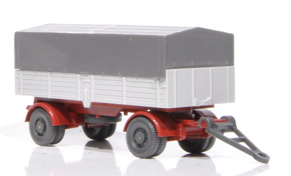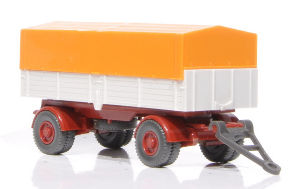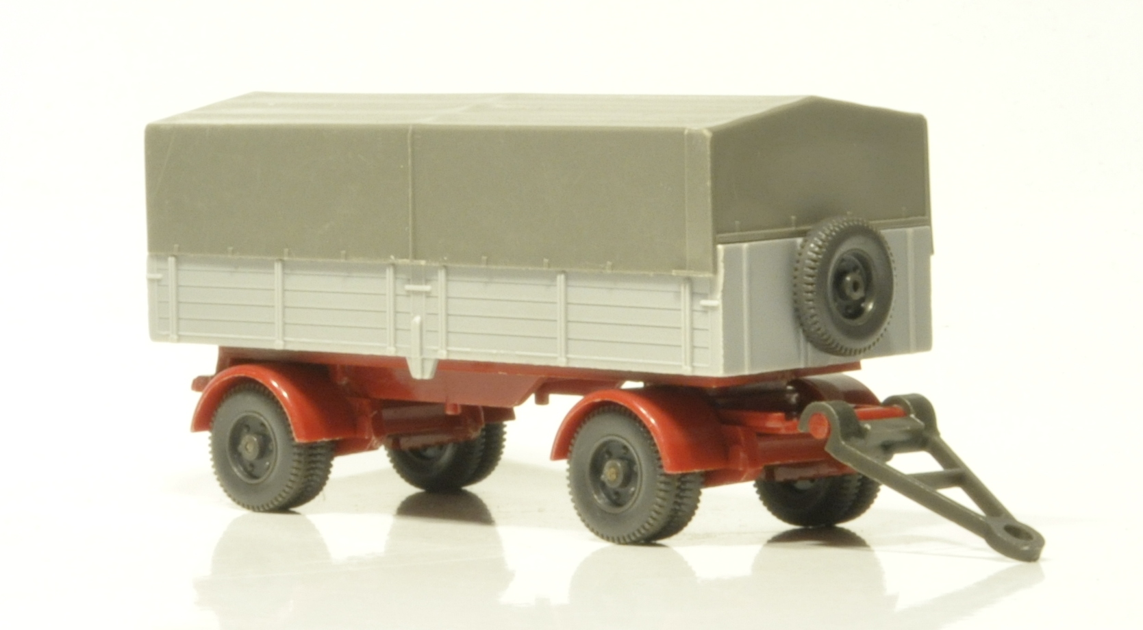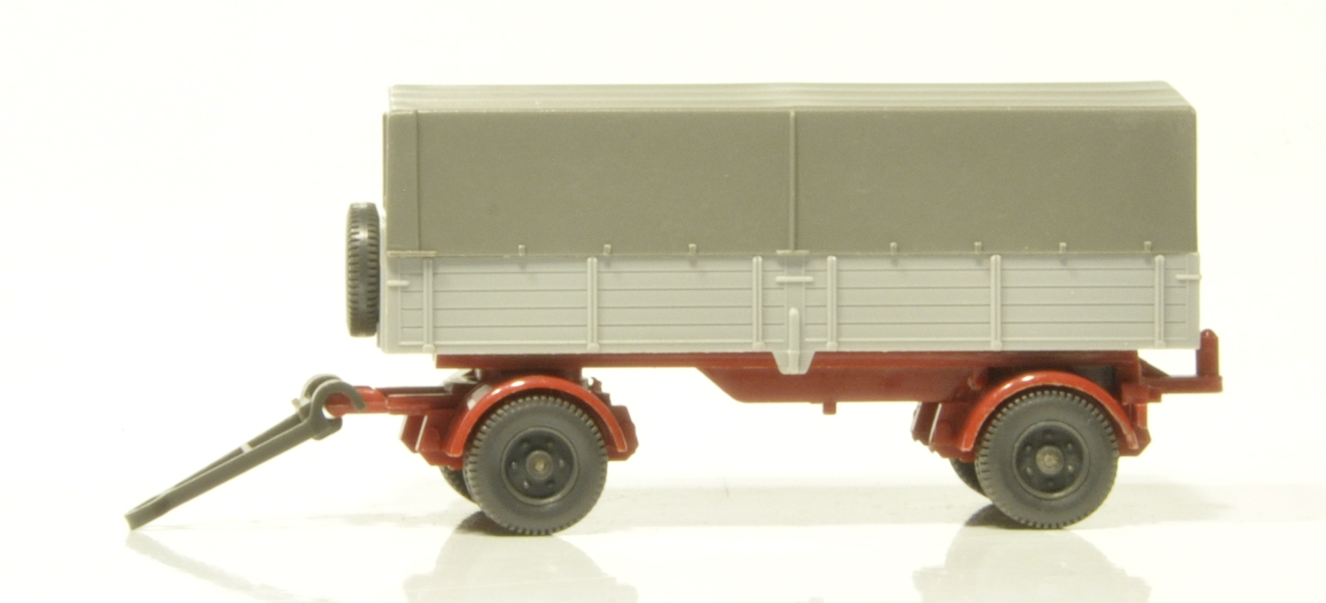 Hänger mit stirnseitig angebrachtem Reserverad, Chassis und Kotflügel hell braunrot.