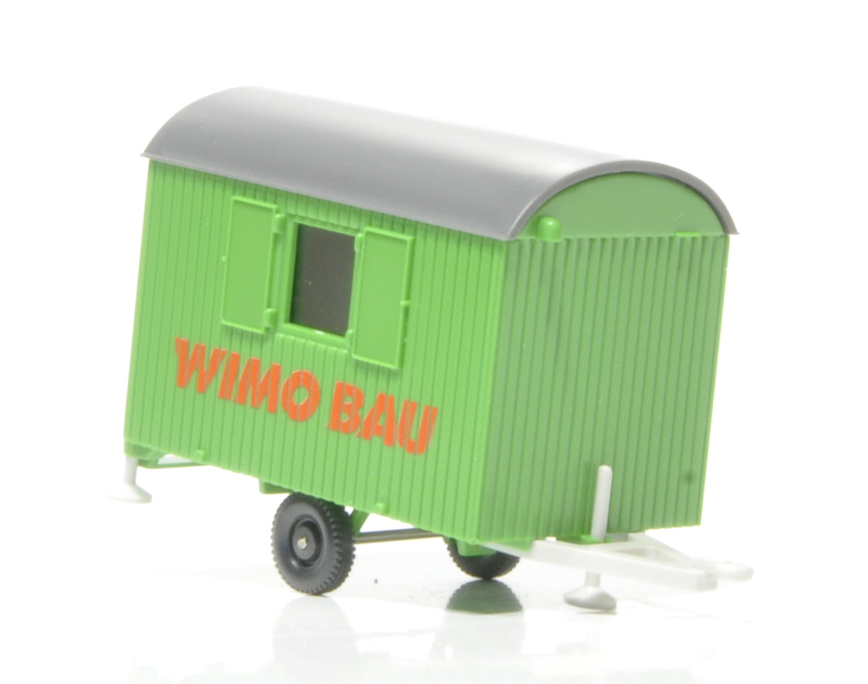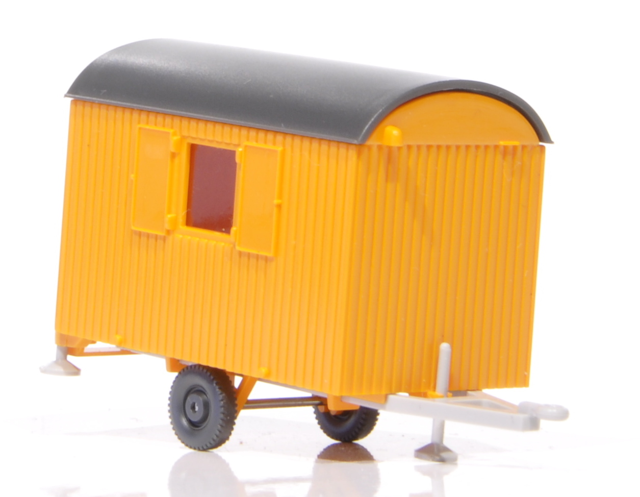 Bauwagen mit aufgesetztem Dach. Inneneinrichtung mit Tisch und Bänken. Holzaufbau mit Fenstern und beweglicher Tür ohne Kamin.