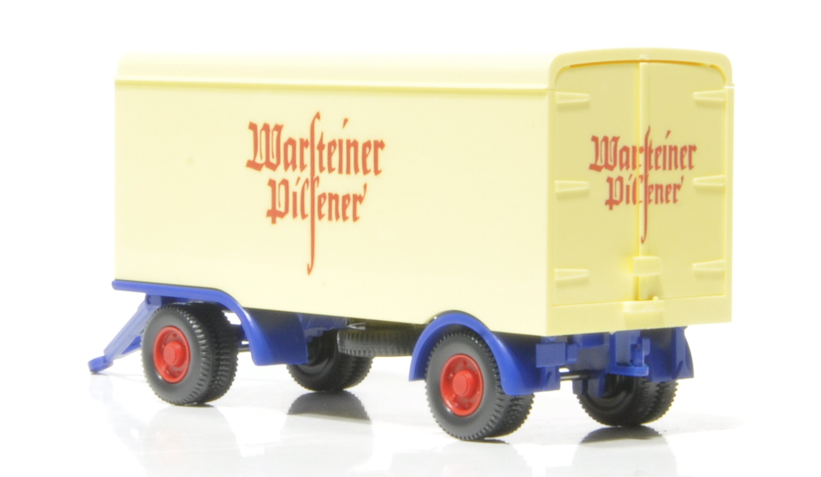 Koffer hell schwefelgelb mit beweglichen Türen. Kotflügel signalblau. Integrierter kleiner Zughaken.